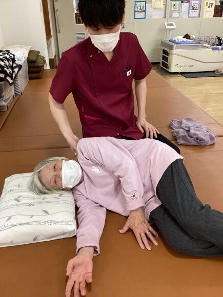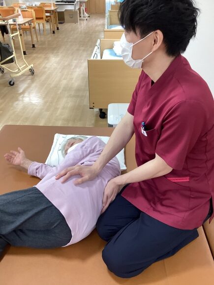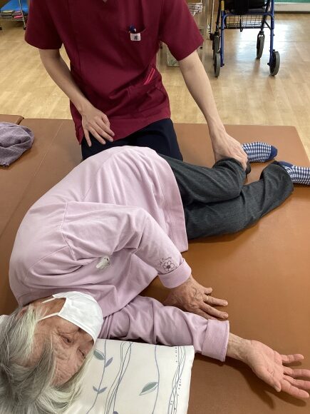 リハビリは運動や歩行練習、拘縮予防の関節可動域運動やマッサージなど様々な形で提供しています。