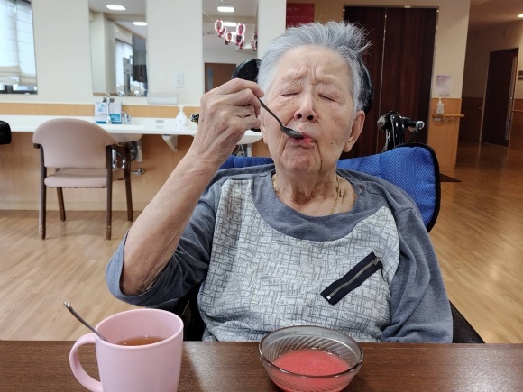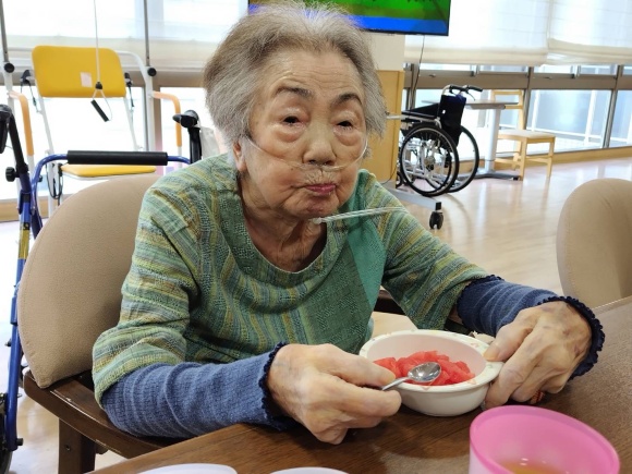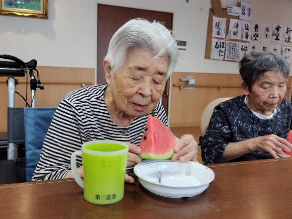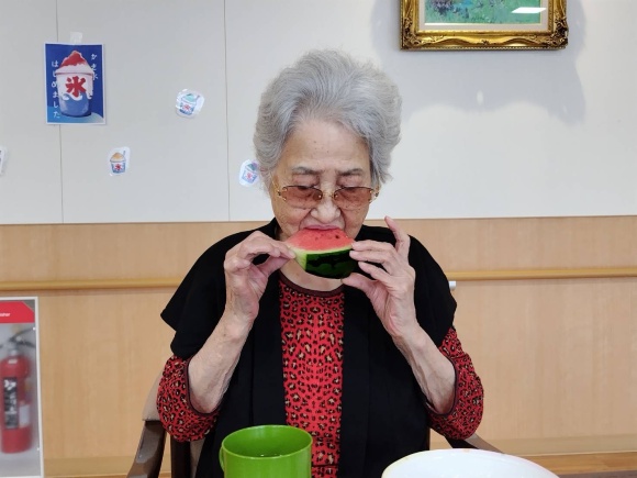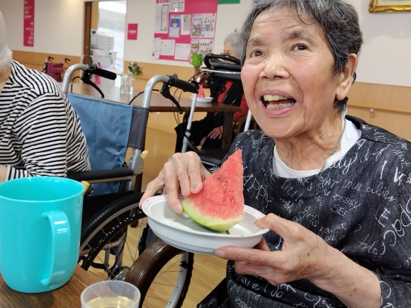 職員より入居者の皆様へと大きなスイカが差し入れされました(#^^#)