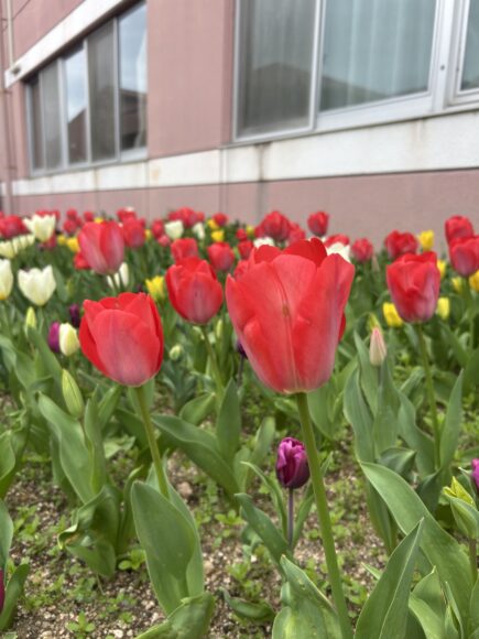 こちらは玄関ホール近くの中庭です。今年もたくさんのチューリップが見ごろを迎えました。
