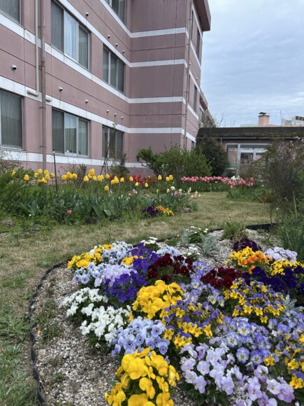 こちらは1病棟と新病棟の間の中庭です。アーチのあるおしゃれな手作り花壇にパンジーやチューリップがもりもり咲いています。香りがただよってきそうですね。担当職員が、多忙のなかこつこつと手入れをしています。とってもきれいですね!