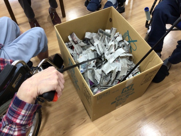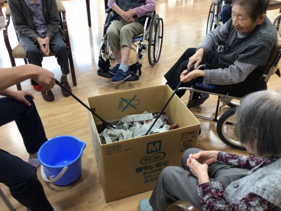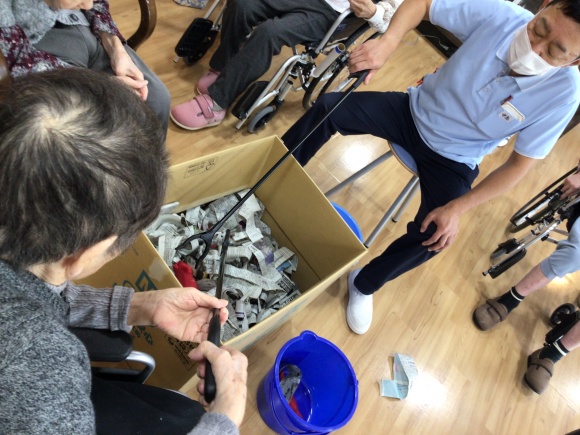 切った新聞紙を土に見立て、その中に埋まっているさつま芋を掘り出す芋ほりゲームです!(^^)!