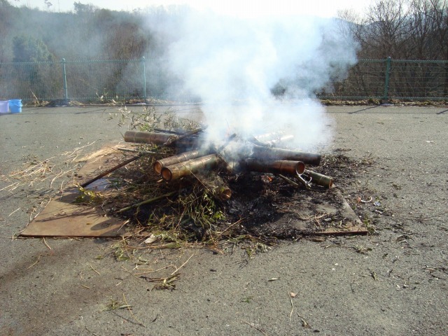 長い竹を組んで門松やしめ縄を入れて火を点けます。