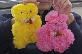 紙花を8つ、両面テープでくっつけて、目と鼻をつけて、首輪をつけると・・・?